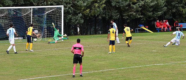 Il penalty viene trasformato da Petterini, il primo tempo si conclude con i Falchetti in vantaggio per 2 a zero e soprattutto in vantaggio numerico.