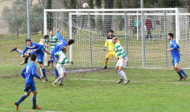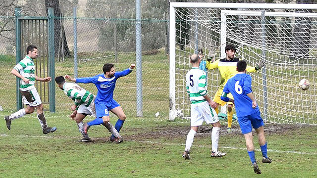 Che oggi la dea bendata non sia favorevole ai campellini si vede anche al 25° quando Celesti, sempre di testa, tenta la realizzazione a due passi dalla porta, la palla centra i piedi del portiere che respinge alla meno peggio.
