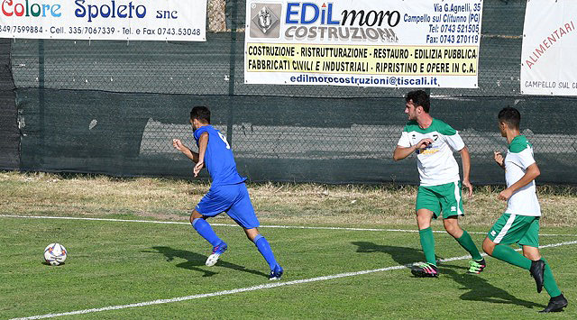Il mister Canzi affronta il secondo impegno di coppa con una formazione che presenta numerose novità rispetto a quella di domenica d’altronde il caldo, la preparazione ancora in corsa e gli impegni ravvicinati consigliano un ampio alternarsi dei giocatori in campo anche in vista del nuovo regolamento che permette ben cinque sostituzioni. L’incontro parte su ritmi blandi poi i padroni di casa accendono l’incontro all’11’ con una bella azione personale di Celesti che sfiora la marcatura. i Biancazzurri si portano in vantaggio su un calcio di rigore realizzato da Rosi al 25’ per un atterramento in area di Conti. Gli ospiti reagiscono e mettono sulla difensiva i padroni di casa ma sono poco incisivi e il primo tempo si chiude con la Clitunno in vantaggio. Alla ripresa i biancazzurri cercano subito il raddoppio ma mancano un paio di occasioni poi colpiscono in contropiede con una pregevole azione quando Celesti, entrato in area dopo una rapida ripartenza, serve un preciso assist al sopraggiungente Capoccia che dal limite della stessa realizza con un preciso rasoterra a fil di palo al 24’. Per gli ospiti partita conclusa. Appuntamento a domenica ad Assisi per l’ultimo incontro di coppa.